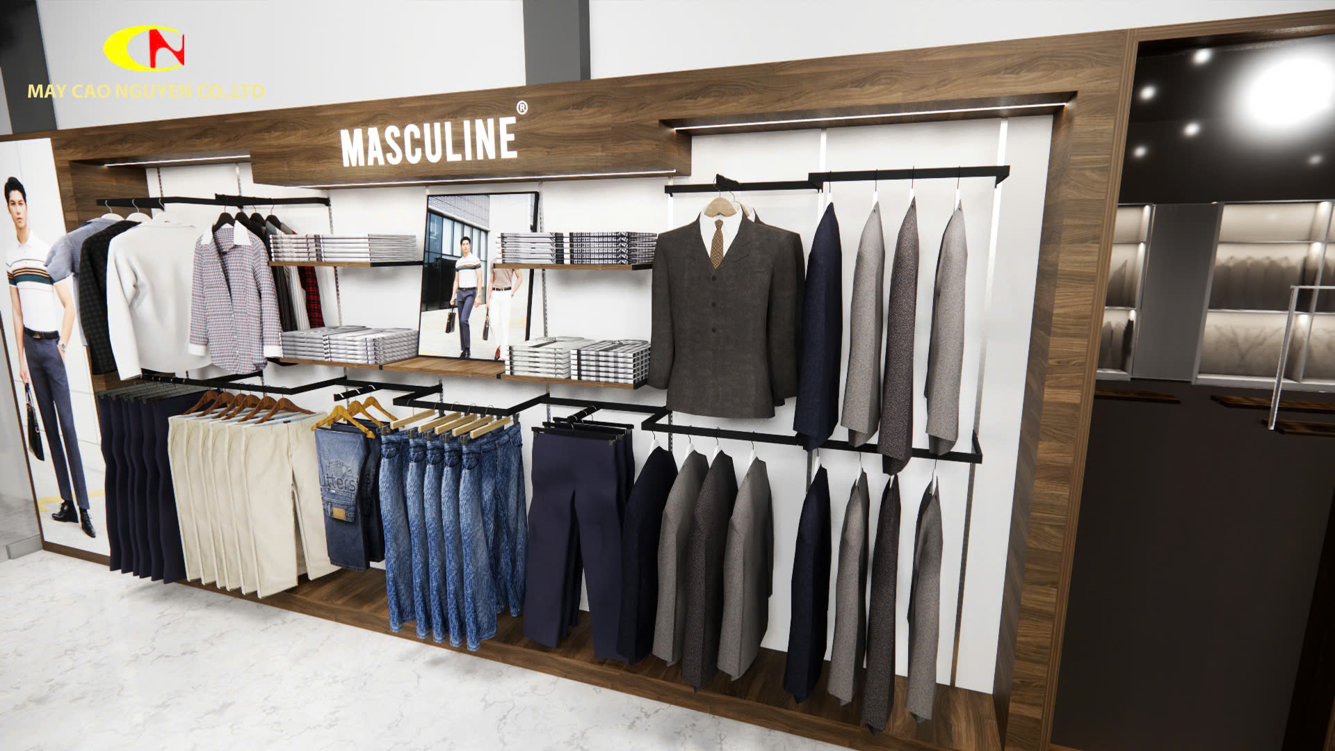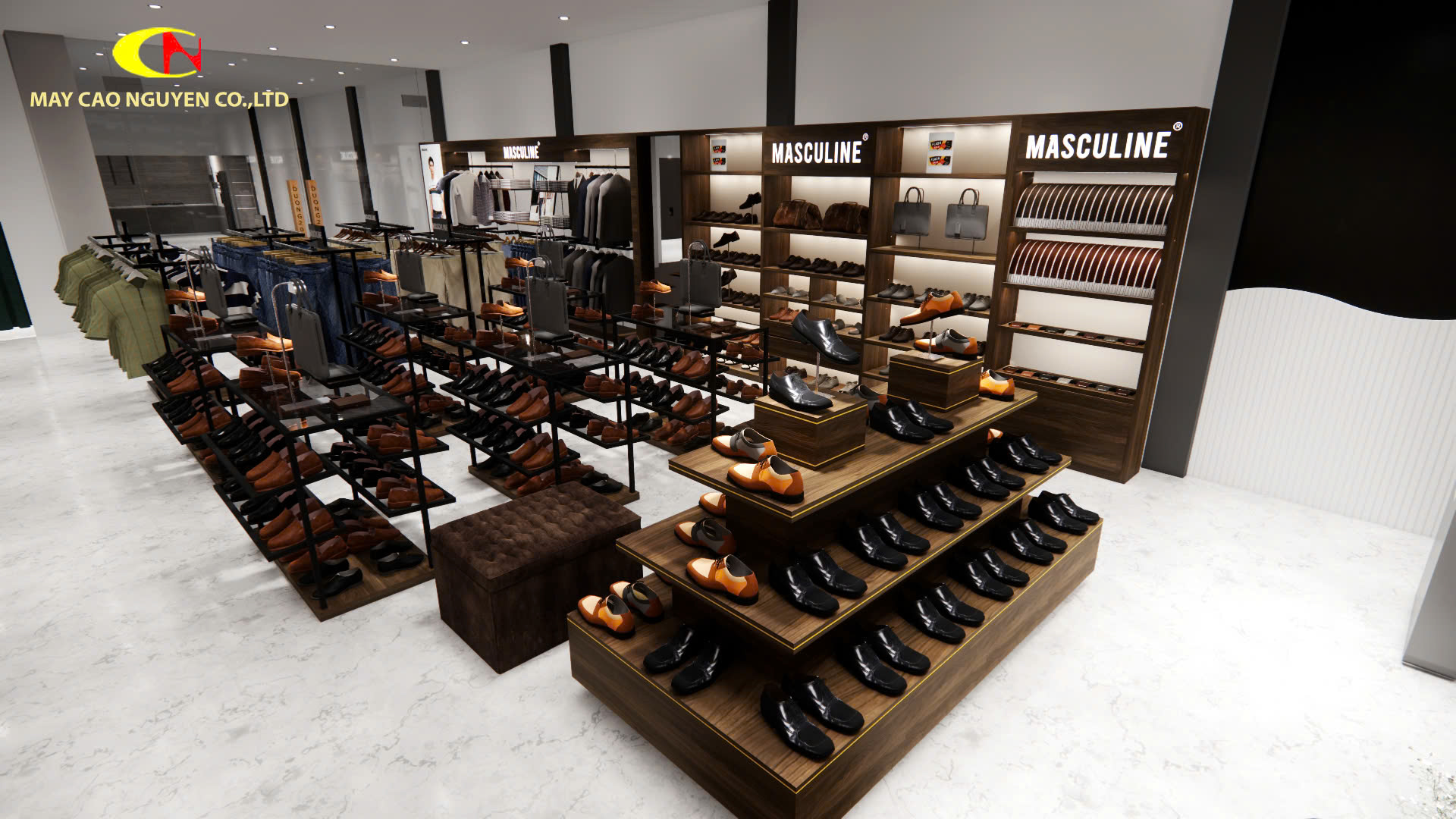 Bao gồm tủ, kệ, biển hiệu và giải pháp trưng bày đồng bộ, tạo không gian chuẩn thương hiệu Masculine ngay trong cửa hàng của bạn.
